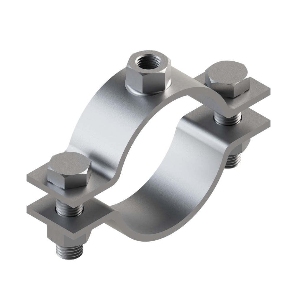- Двухэлементный хомут из высокопрочной стали обеспечивает лучшую фиксацию трубы за счет увеличенной ширины и толщины пластин;