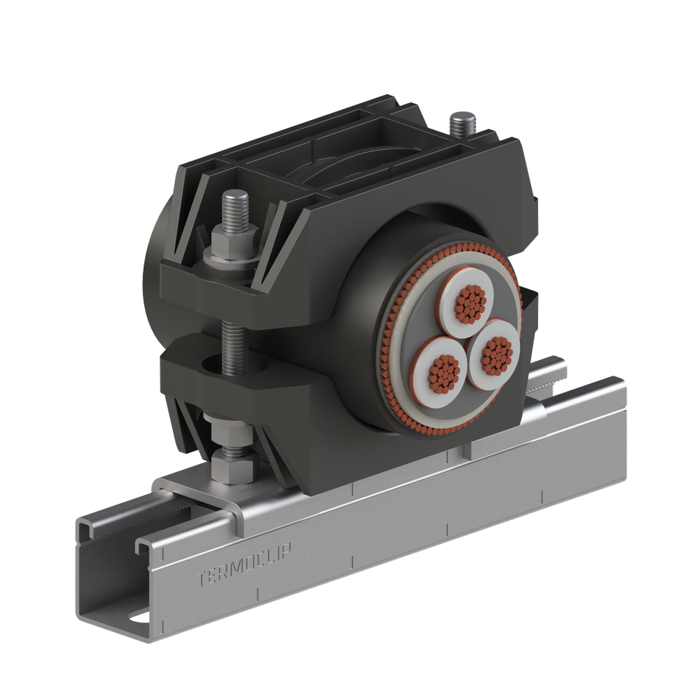 Крепеж кабельный ТСС 1 применяется для одиночной или групповой прокладки кабелей низкого, среднего и высокого напряжения до 500 кВ, всех типов, в том числе включая с внешней изоляцией из ПВХ и сшитого ПЭ. Типоразмерный ряд крепежа имеет диапазон диаметров кабелей от 25 мм до 165 мм. Динамическая стойкость крепежа к токам короткого замыкания - до 200 кА.Материал: