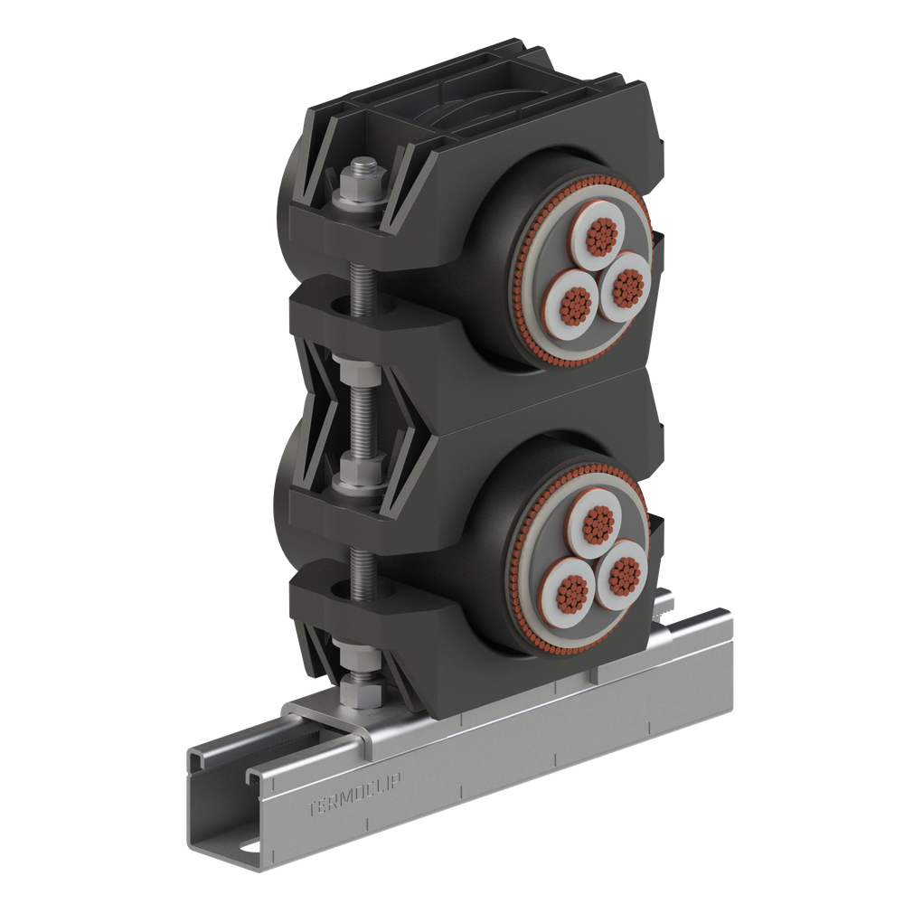 Крепеж кабельный ТСС 1 применяется для одиночной или групповой прокладки кабелей низкого, среднего и высокого напряжения до 500 кВ, всех типов, в том числе включая с внешней изоляцией из ПВХ и сшитого ПЭ. Типоразмерный ряд крепежа имеет диапазон диаметров кабелей от 25 мм до 165 мм. Динамическая стойкость крепежа к токам короткого замыкания - до 200 кА.Материал: