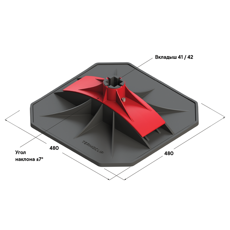 Опоры 480, выполненной из микроармированного полимерного композита; Коврика резинового противоскользящего виброизоляционного 480х480; Траверсы поворотной, регулируемой, выполненной из микроармированного полимерного композита;Вкладыш (адаптера) под установку различного типа монтажных профилей; Два фиксирующих болта с гайкой.