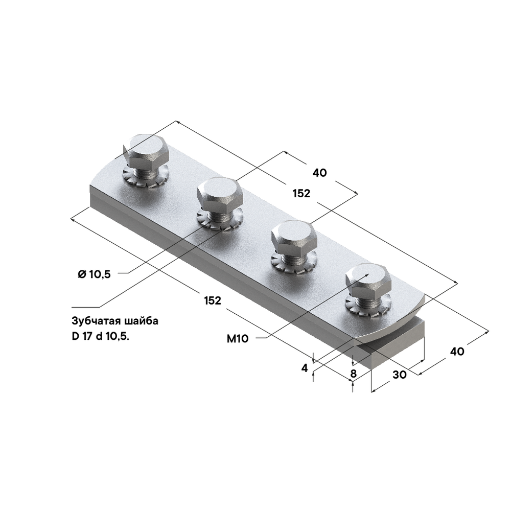 - Соединительный элемент вставляется в соединяемые профиля и затем крепится/фиксируется при помощи четырех крепежных винтов и шайбы (4 отв. 10.5 мм).