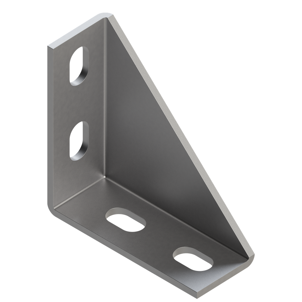 Прочный усиленный угол предназначен для соединений элементов конструкций профилей, рамных и стеллажных систем. Сплошная угловая консоль обеспечивает усиление несущих конструкций как для средних, так и для тяжелых систем с учетом статических нагрузок. Эффективное использование усиленного угла для монтажа непосредственно на перекрытии, стене и полу. Для монтажас профилями в качестве: подпорки, кронштейна, опорного основания, узлового соединения, упорного угола, соединительного элемента, угловой консоли.Материал: